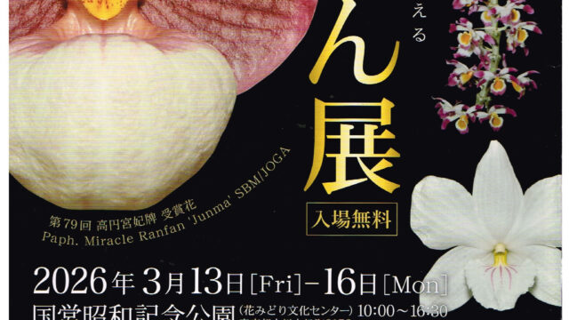 イベント情報 第80回JOGA洋らん展 2026年3月13日金曜日から3月16日月曜日まで東京都立川市の国営昭和記念公園 花みどり文化センターで開催される第80回JOGA洋らん展に出店します。日本洋蘭農業協同組合の主催する最大のイベントです。是非ともお越しください。 2026.03.13 イベント情報